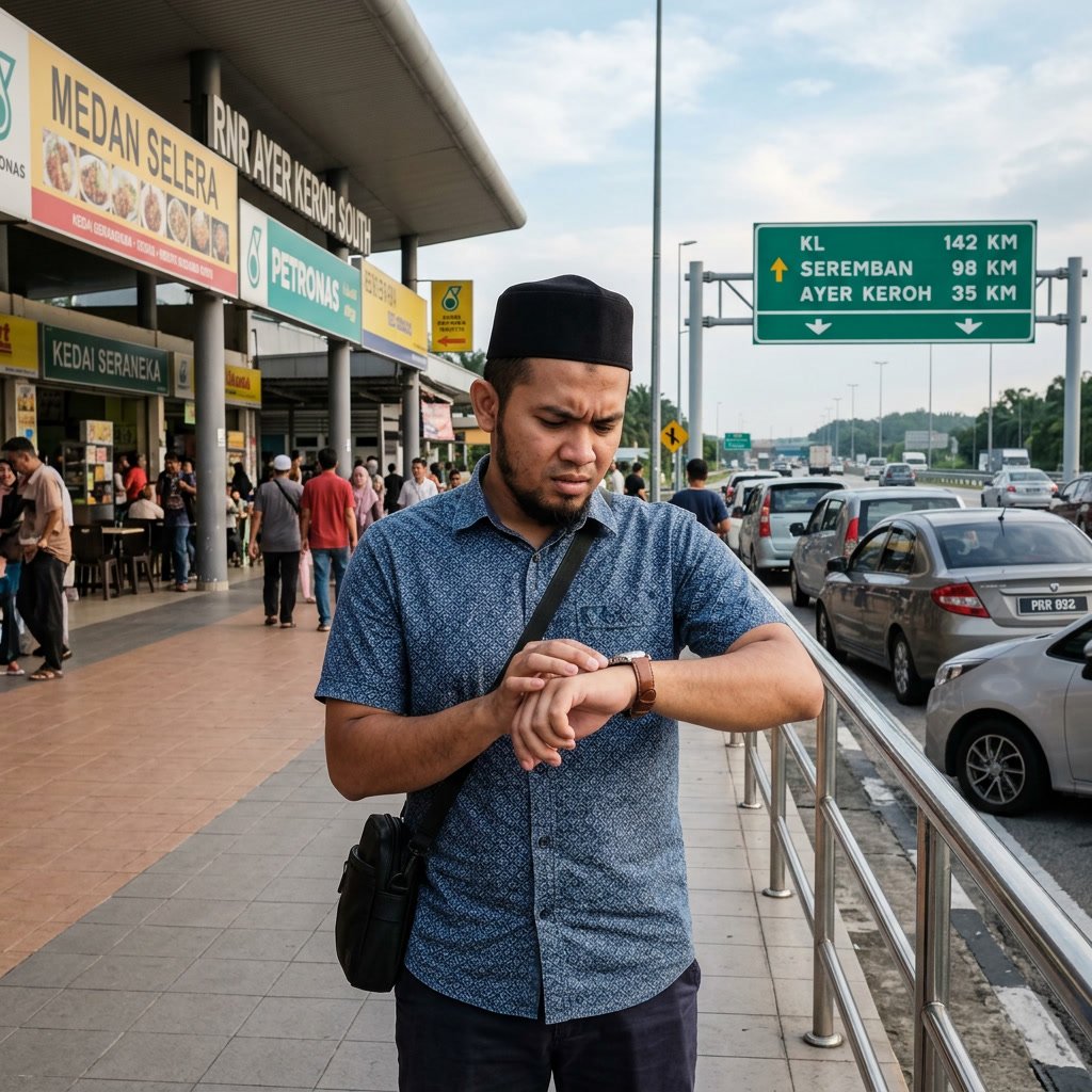 ❌ Kereta langsung tak bergerak. Waktu Maghrib makin habis, Isyak dah nak masuk. Nak solat dalam kereta atau tunggu R&R?